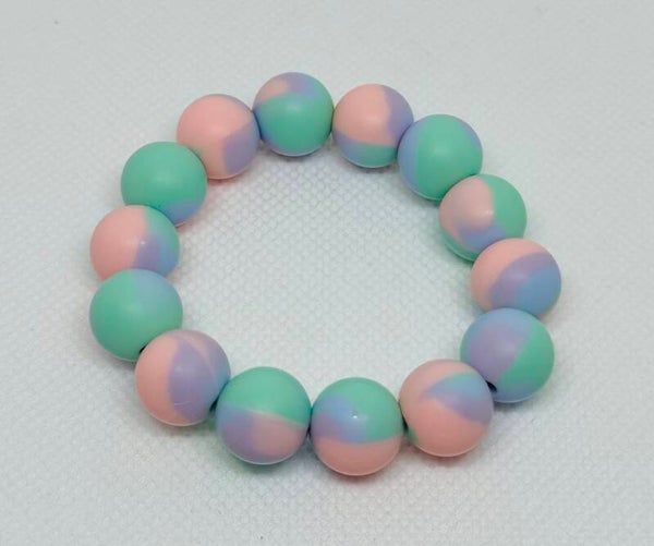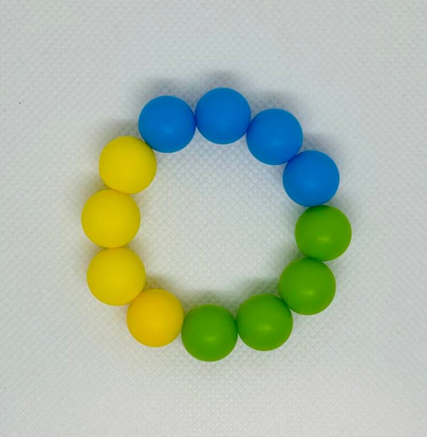 Baby teething ring made with 12mm food grade silicone beads. Easy to clean.